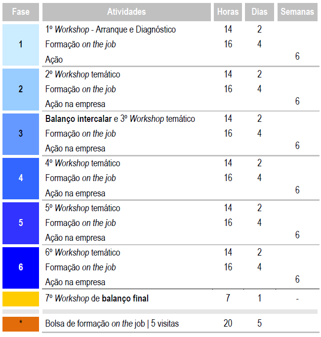 • A atividade desenvolvida na empresa (ação na empresa) consiste na implementação de um plano de ação, definido após a realização de um diagnóstico personalizado, e apoia-se nas aprendizagens adquiridas nos workshops e na formação on the job;